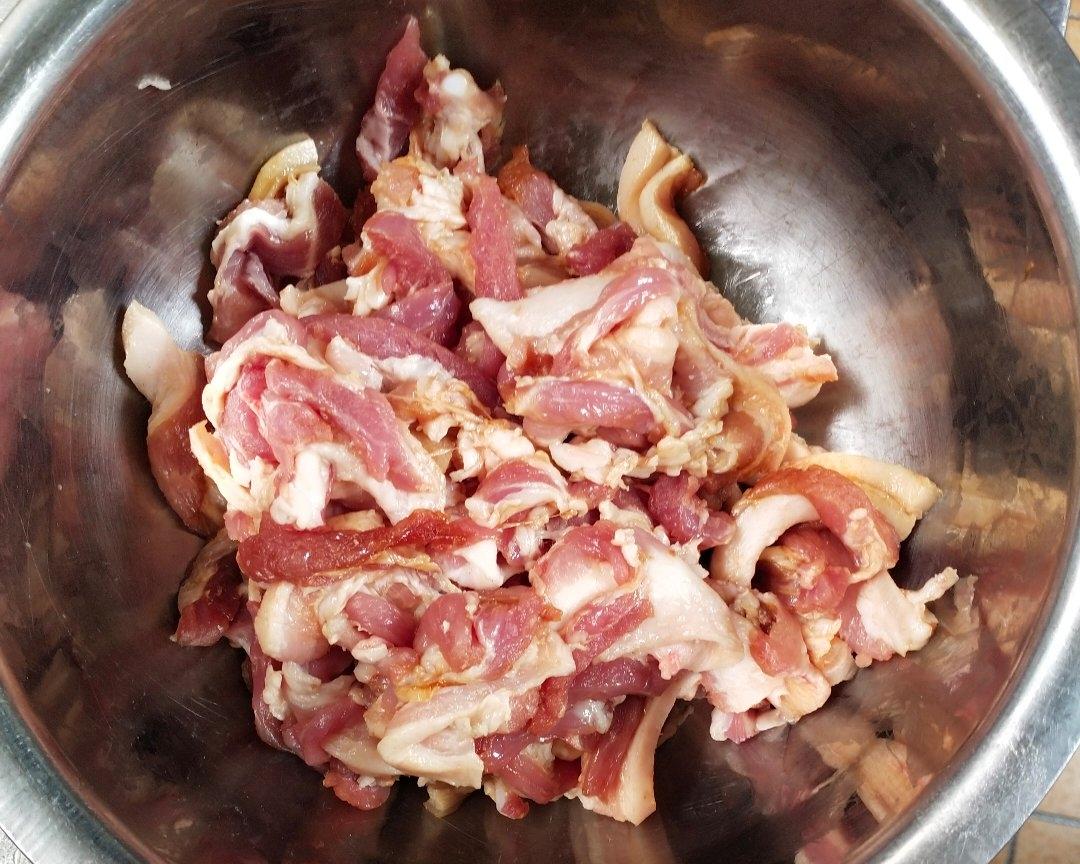 接着锅内在烧油,下入五花肉翻炒,