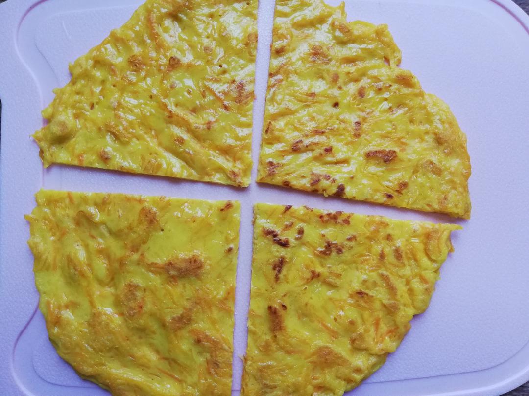 南瓜150克、胡萝卜50克、两个鸡蛋、面粉80克、清水100克左右、食用盐适量