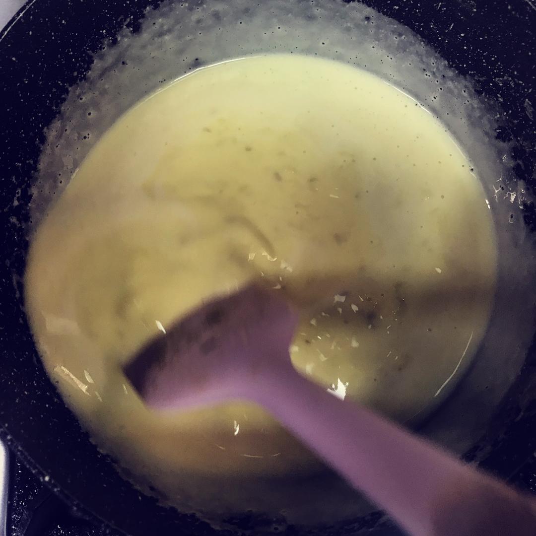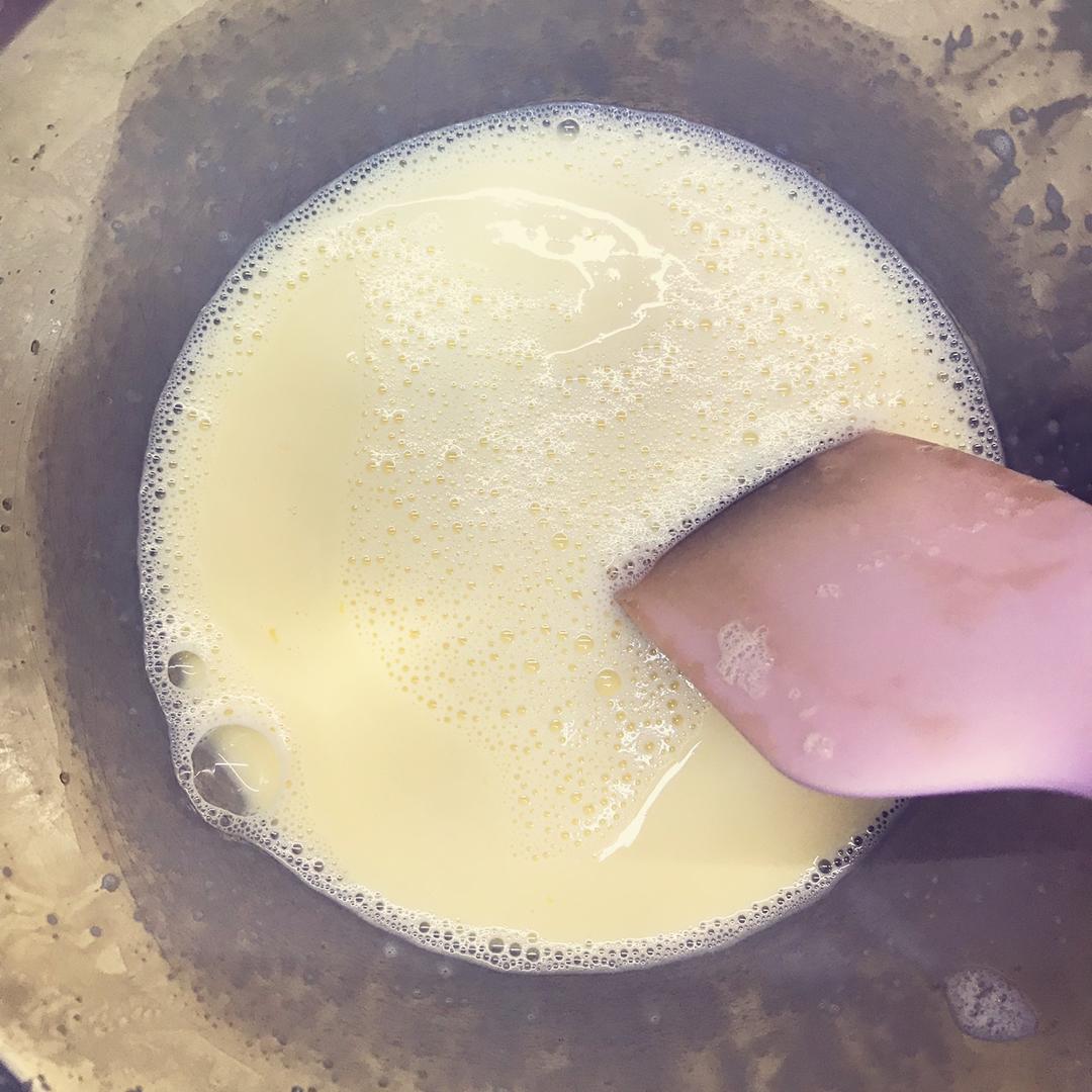 牛奶上锅小火煮至边缘冒泡,分少量多次倒入刚才的蛋液中,注意倒的时候要快速搅拌,不要给烫成蛋花,烫成蛋花就失败了!