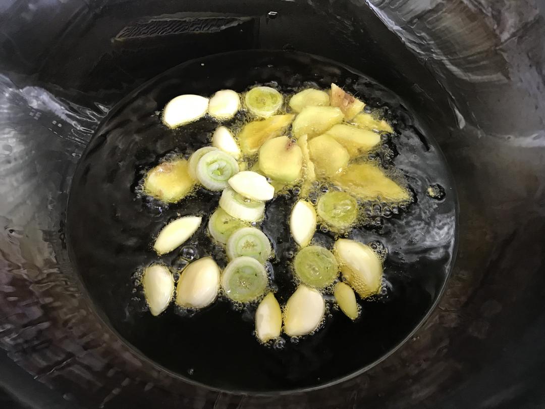 锅中倒油把葱姜蒜下油锅炸出香味捞出来