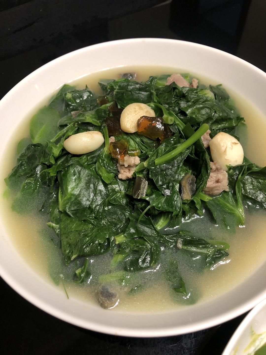 在饭店的菜单都会写[上汤豆苗],所以这个汤,很重要,可以带出豆苗的鲜甜。 这次用了几块小排骨,提前煮了个汤,然后把排骨肉拆下来,也可以放到豆苗里面。