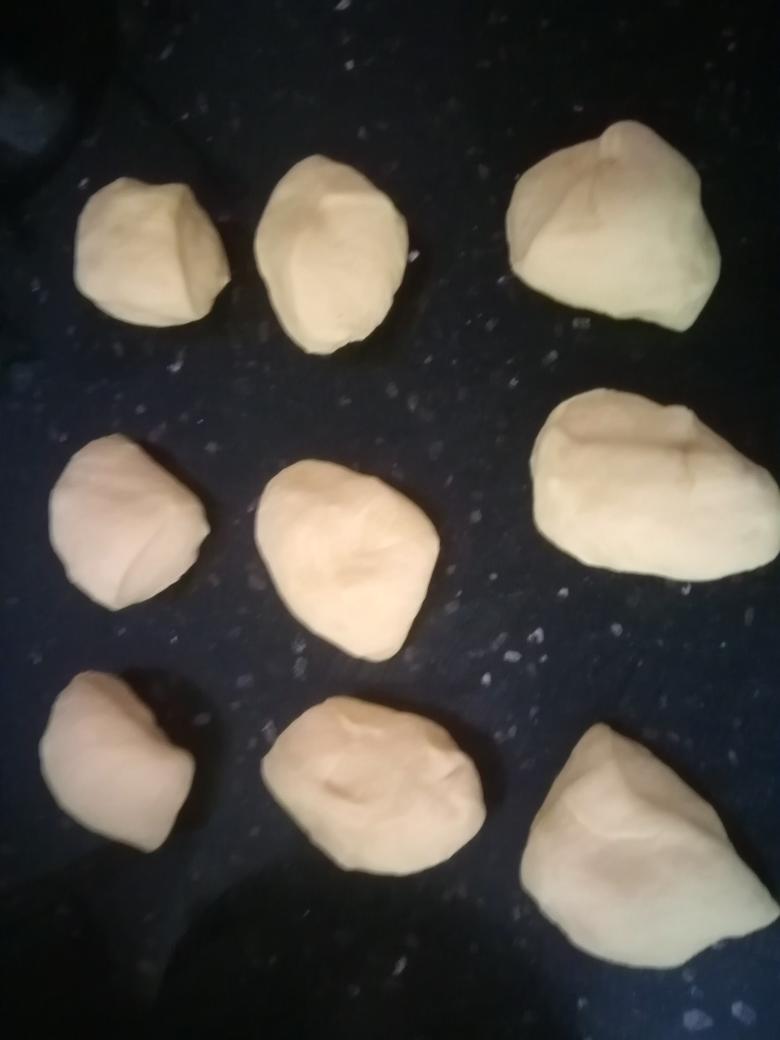 取出发酵好的面团滚圆排气,配方总量 约513克,分割小面团9个,每个57克。