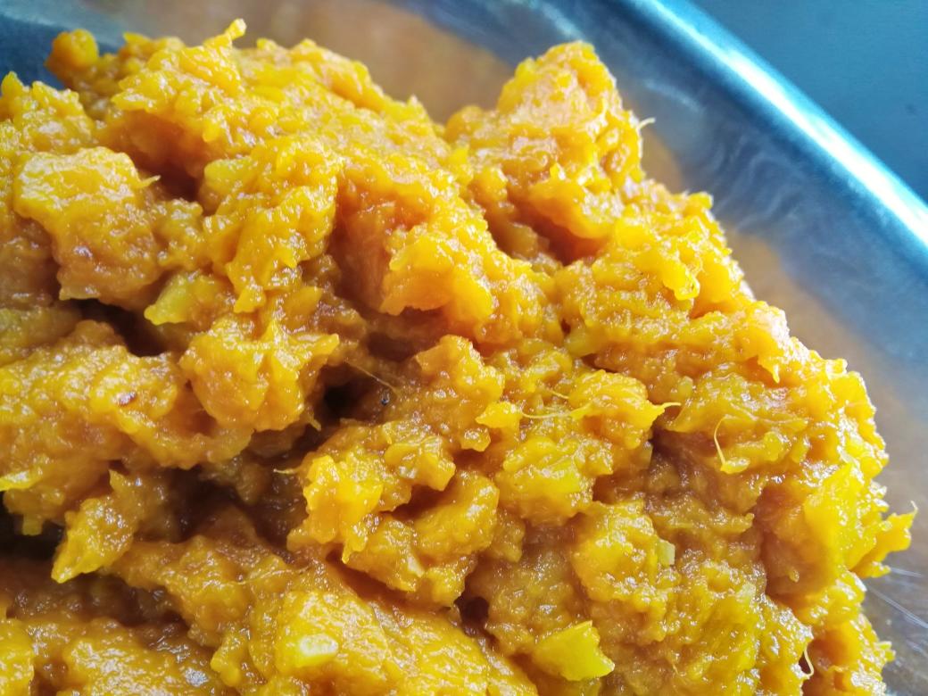 南瓜洗净切薄片,水烧开后上锅蒸15-20分钟, 也可做饭时放个架子蒸熟,蒸好后称出所需克重,用汤勺或大调羹压烂,夏天放凉再用, 冬季可热混合。