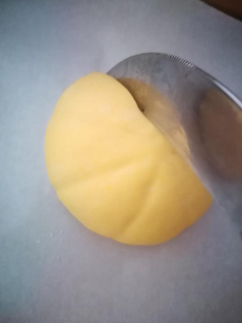 晾凉的南瓜糊除油外和配料表所有食材混合揉光滑,再加油揉搓至面团柔软亚光,整成圆形放入容器加盖或保鲜膜发酵60分钟约2倍大,按压时不缩不弹不塌。