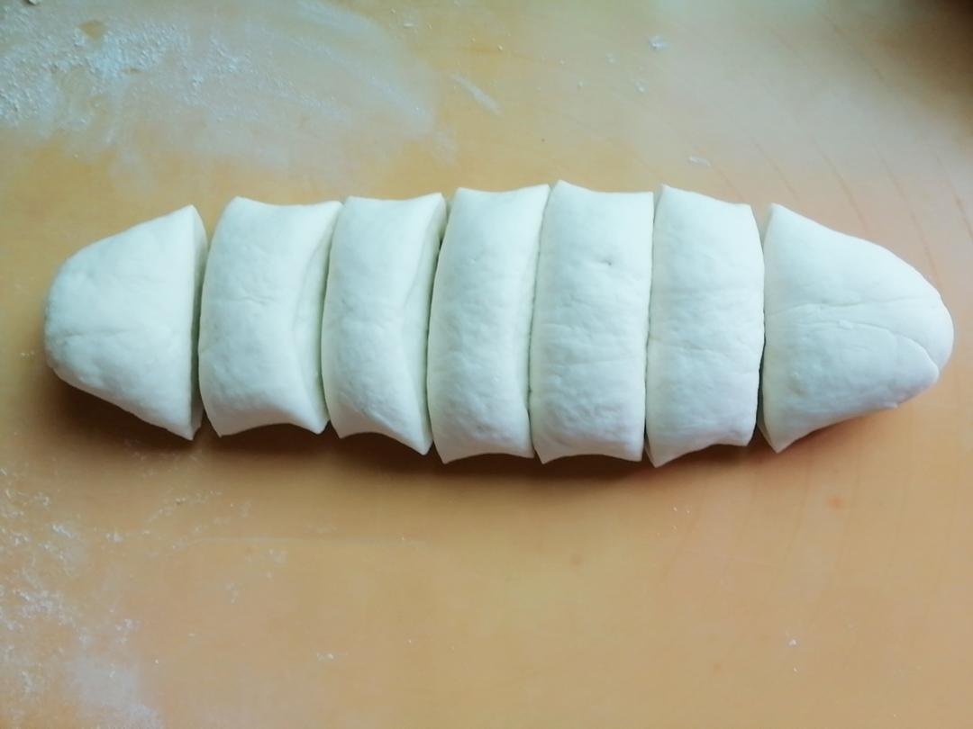 撒点干面粉,把醒发好的面团取出揉揉,排排里面的空气后搓成长条,分成均匀的几个面剂后再分别把它们揉搓成圆形