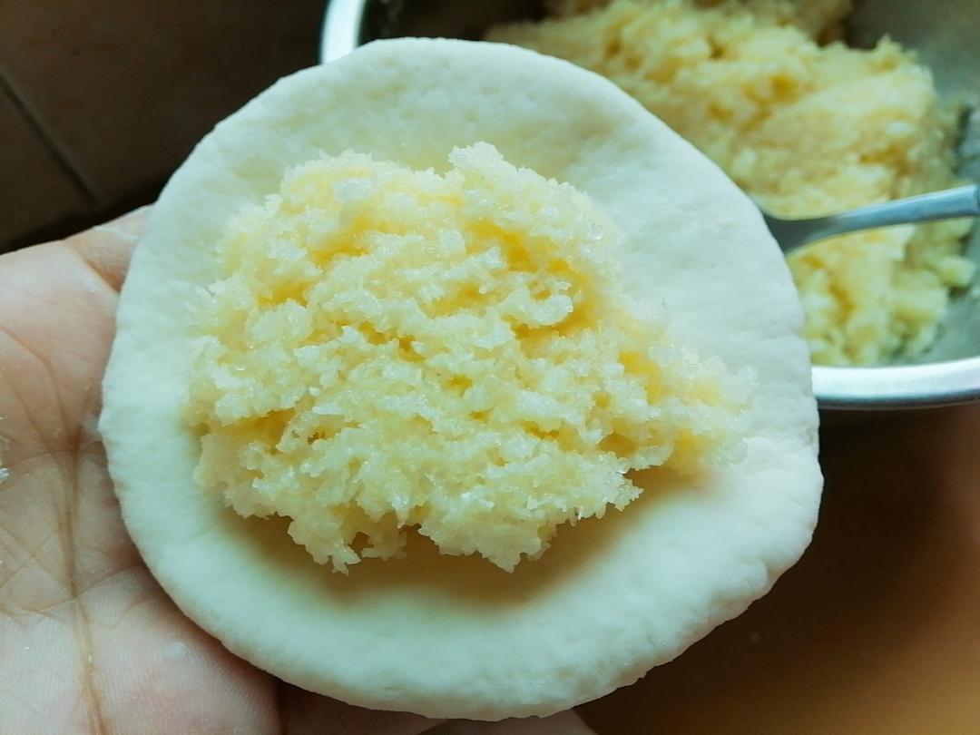 取一个圆剂子按扁,包入椰蓉馅