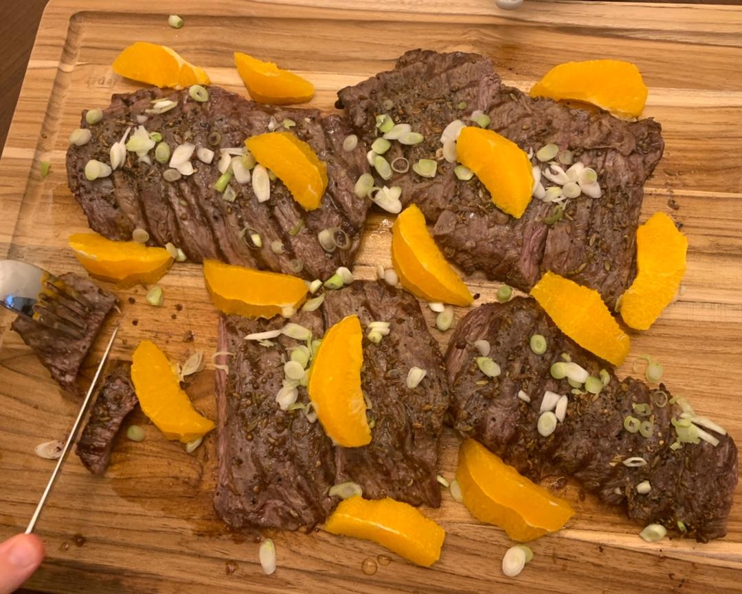 将葱片撒在牛排上,鲜橙摆开