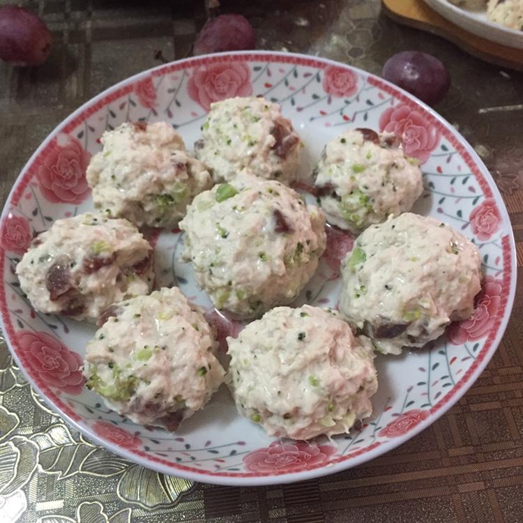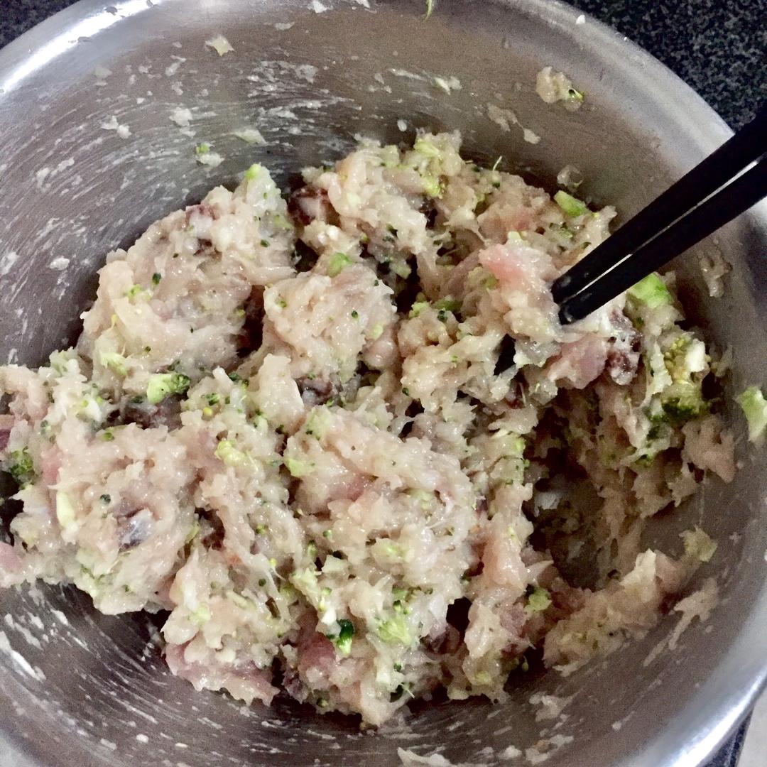 鸡胸肉、西蓝花、腊肠 以上食材剁碎混合,加盐、油、生粉、酱油、胡椒粉搅拌。