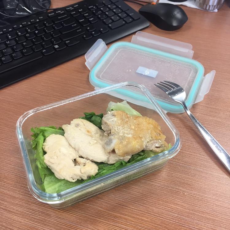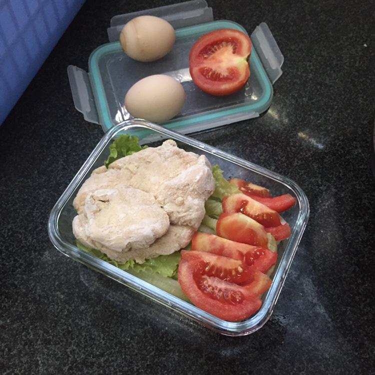 鸡胸肉+生菜+番茄 Ps.:生菜、番茄这种可生吃可熟吃的蔬菜,不需要预先煮熟,中午放微波炉,高火2.5分钟,即可食用;喜欢吃软的多叮一分钟。