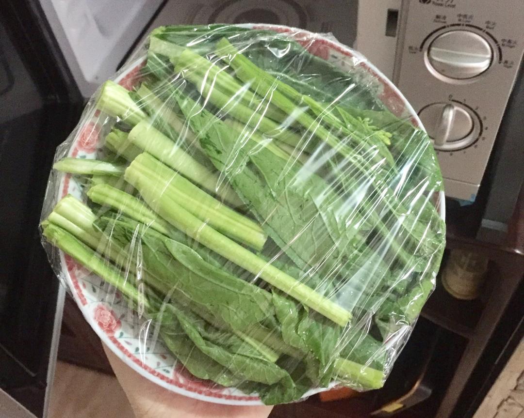 蔬菜:洗净↣装盘↣包保鲜膜↣微波炉中高火3-4分钟↣放凉装盒。 P.S.:本食谱所有蔬菜,都能用此方式处理。