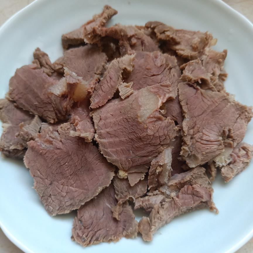 牛腱子肉两斤,洗净,和香料(姜,八角,桂皮,香叶)一起放水里卤,不用放盐和酱油,大概卤一个小时