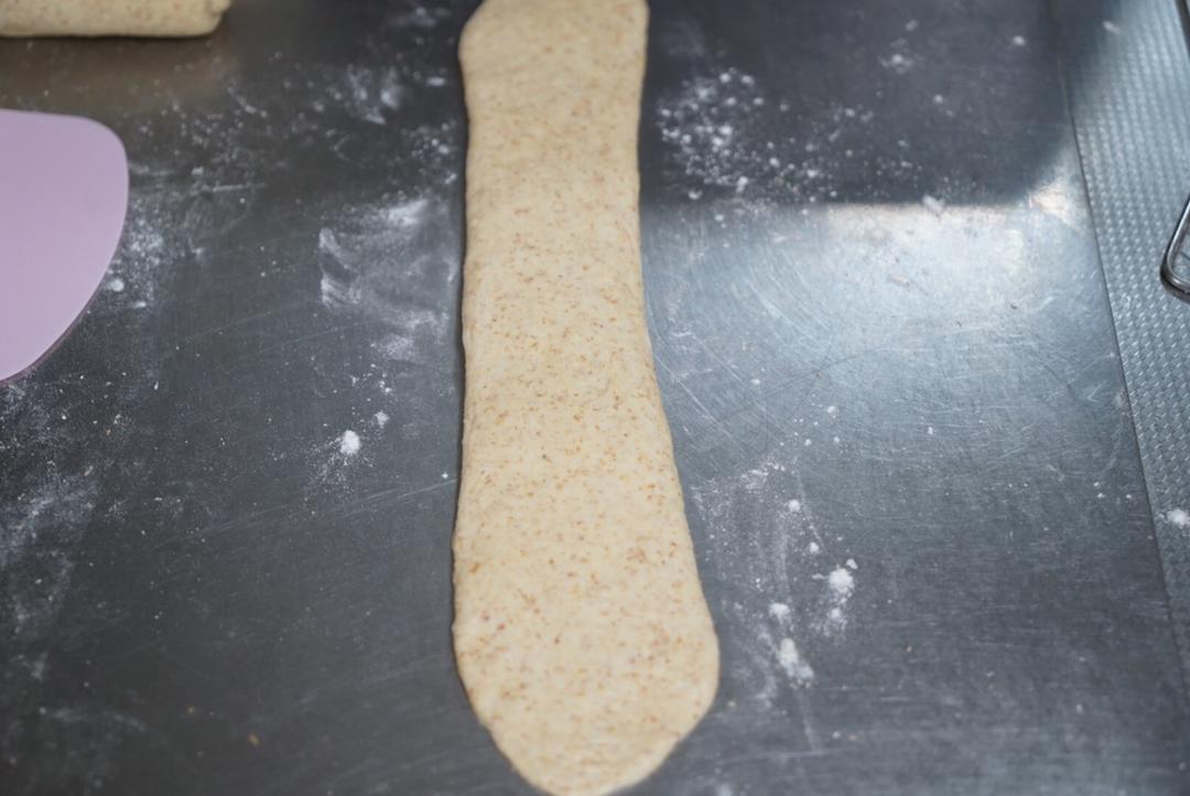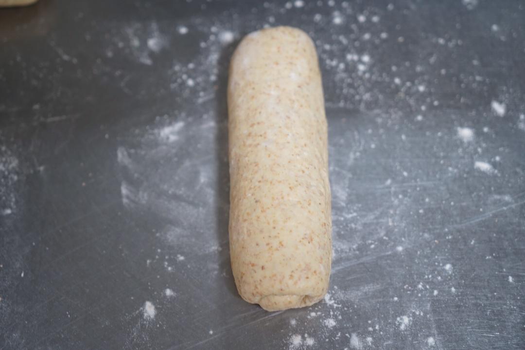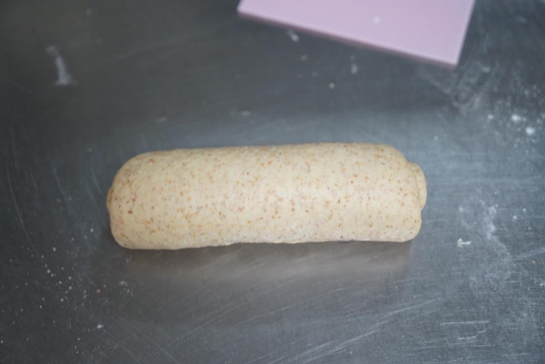 现在开始准备给面团塑形。面团放在面板上,如果粘的话撒一些全麦粉