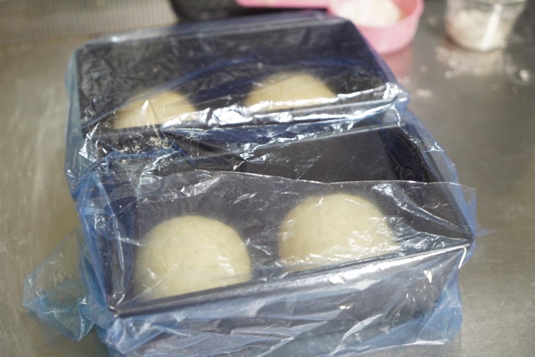 放入吐司盒中,准备最后发酵。温度36度,湿度85%的环境为最佳环境,不过我实在是懒得,直接盖了保鲜膜室温发酵了
