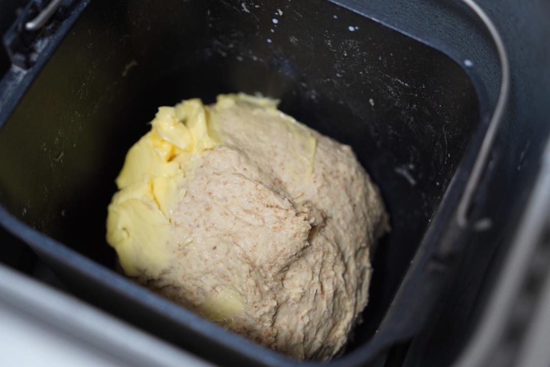 面包机揉面成团后放入室温软化的黄油。此时,我大概揉了11分钟