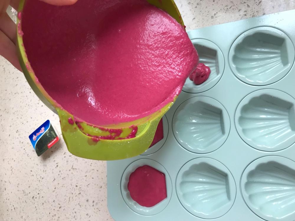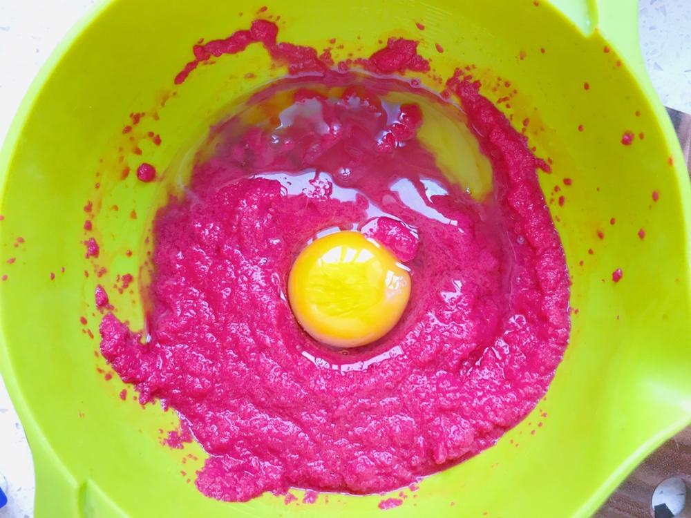 这个量可以烤12连模一盘的量哦 烤完娃吃了8个 外脆里嫩太好吃了颜色也红红火火!甜菜根遇到碱性的泡打粉容易掉色,所以必须添加柠檬汁或者白醋,这两者都是护色的哦! 所有材料准备好