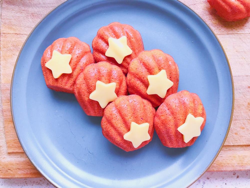 烤好的玛德琳立即出炉脱模,安佳芝士用模具刻出星形,趁热贴上星星筛上糖粉等装饰即可