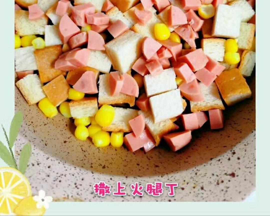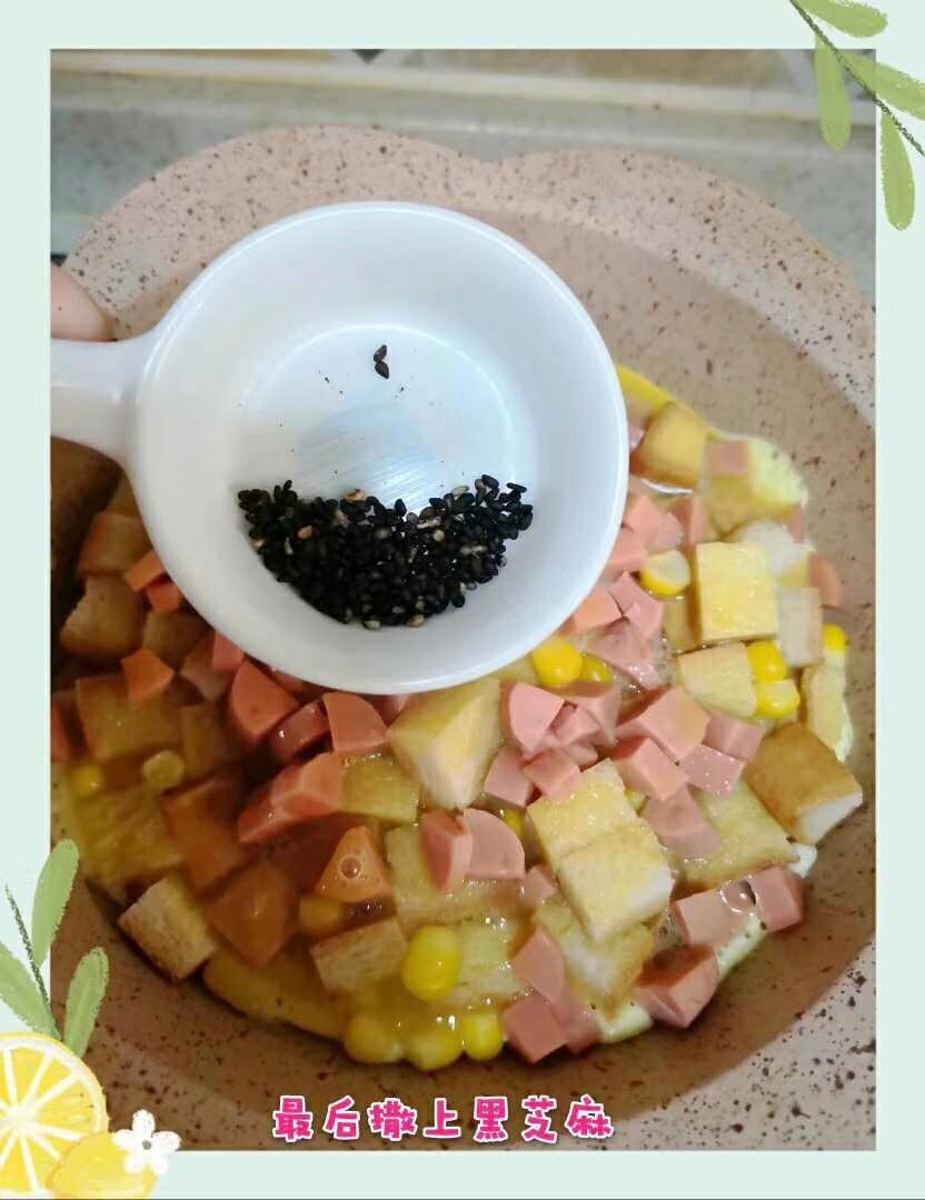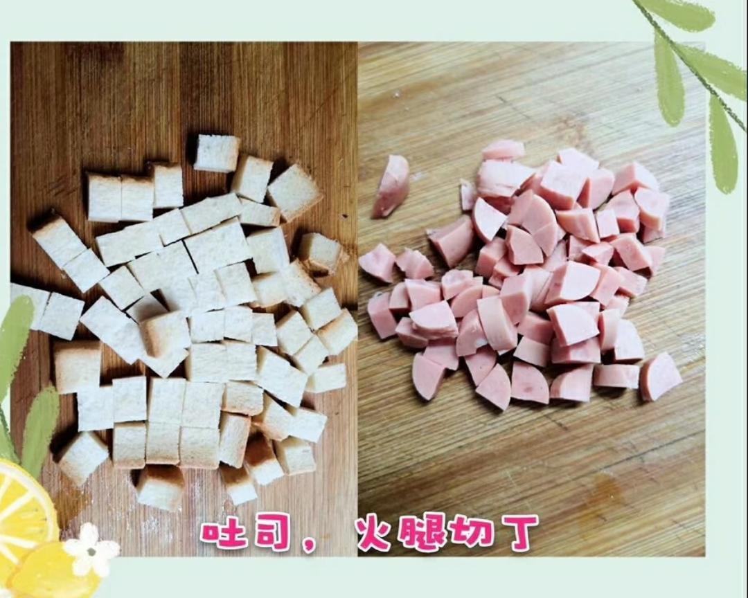 准备好食材,吐司面包,火腿肠,鸡蛋,玉米粒,银鱼粉。