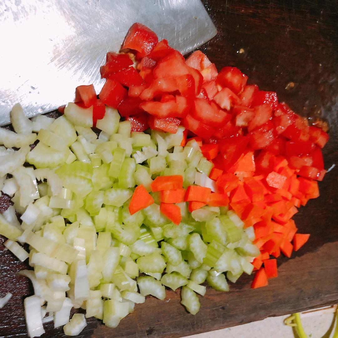 西红柿、西芹、胡萝卜切丁,注意我说的两根西芹是一棵上的两片啊,不是两棵😓