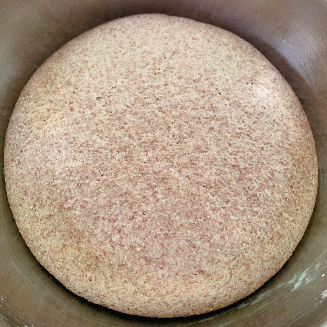 把500g黑全麦面粉+100g面粉放到盆里,5g酵母粉用温水化开,少量多次的倒入面粉中,把面和匀。面和到软硬适中不粘手即可,面光,盆光,手光😜