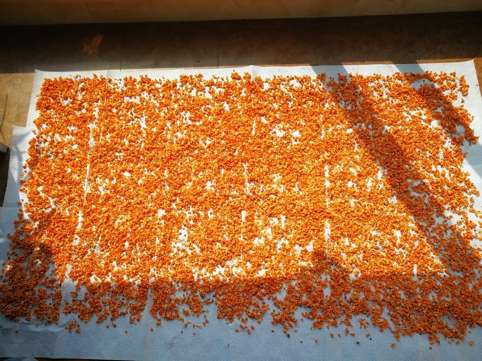 另外一些专门的丹桂洗好以后在阳台铺厨房用纸,均匀撒好晒干,因为阳台瓷砖的温度今天的太阳也比较给力,一天就晒干了。
