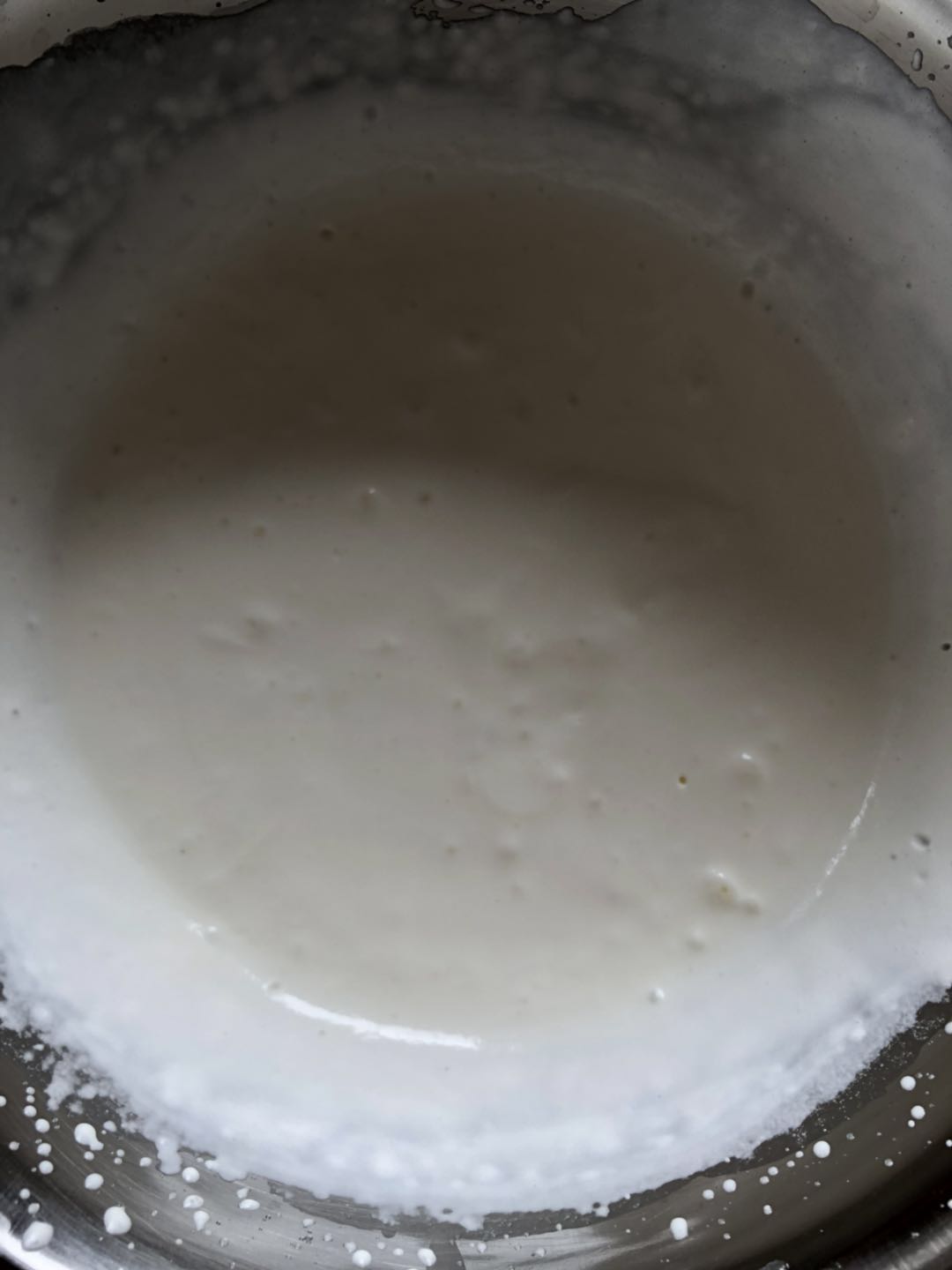 倒入牛奶和黄油(越是烫越是不容易消泡)