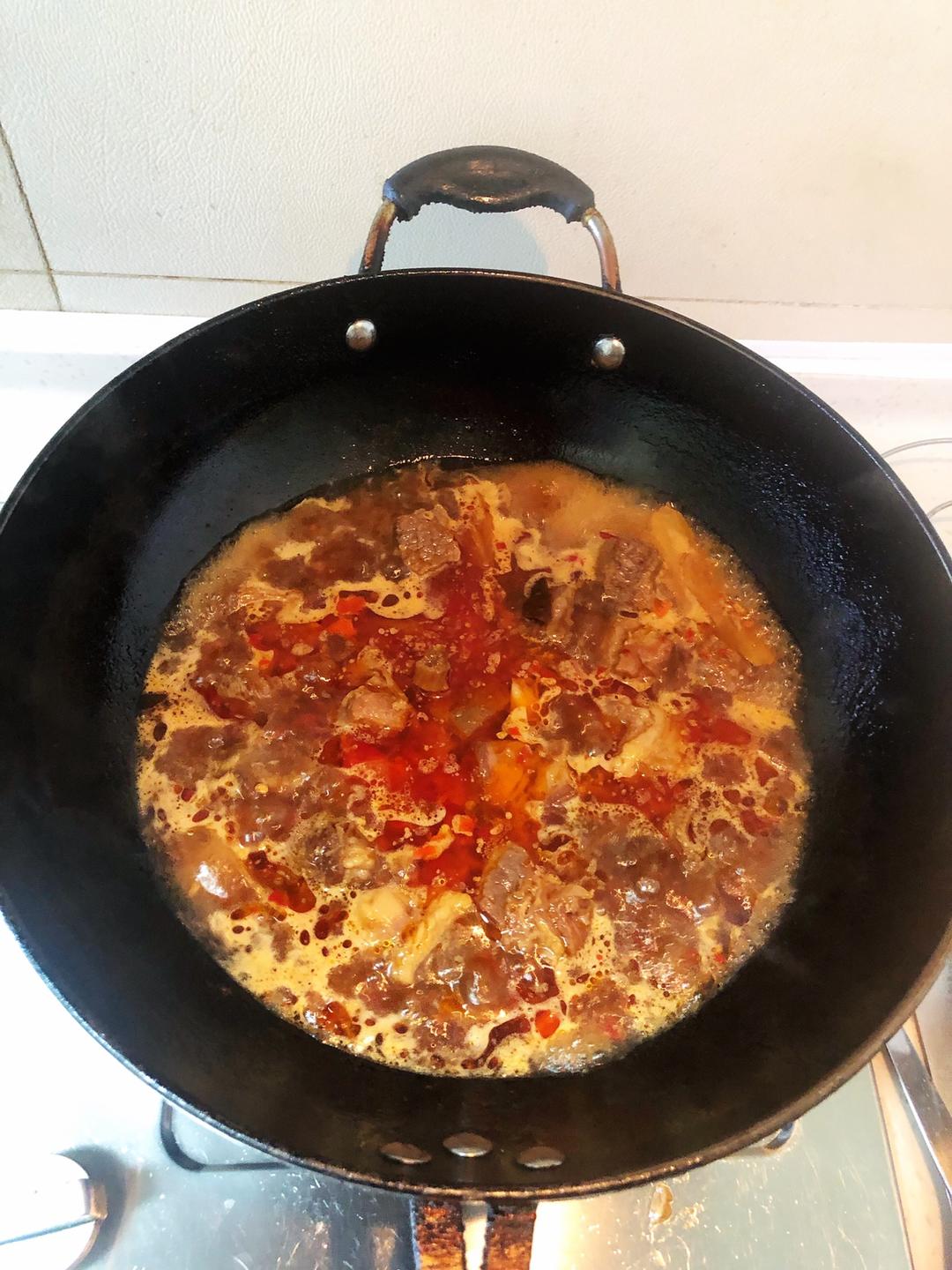 把刚刚烧好的牛肉连肉带汤倒进去 再加一碗水