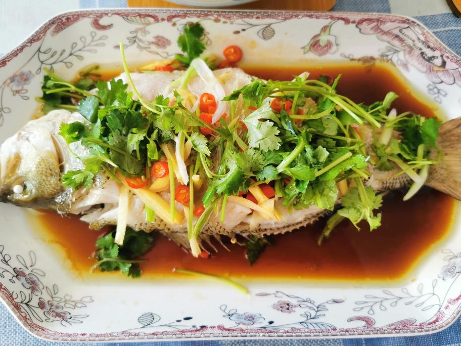 在鱼的身上加一些葱丝、姜丝,小米椒。在鱼的两边加入适量蒸鱼豉油。千万不要把豉油加在了鱼身上!!!