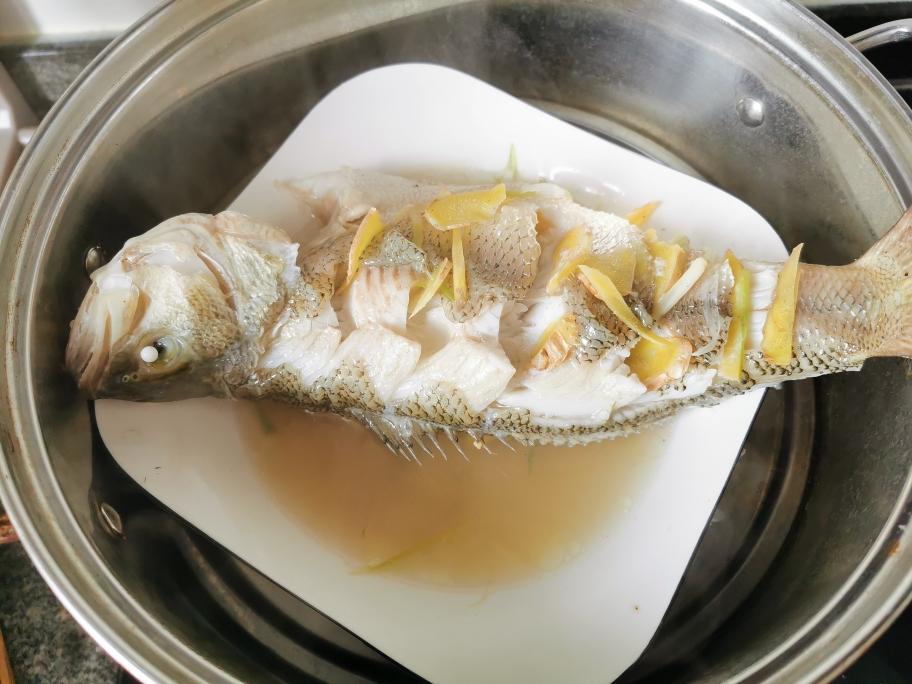 将腌制好的鱼放在蒸锅里蒸8-12分钟,蒸好后将水和姜片、葱白倒掉。水一定要记得倒掉,换个餐盘,不然有腥味。