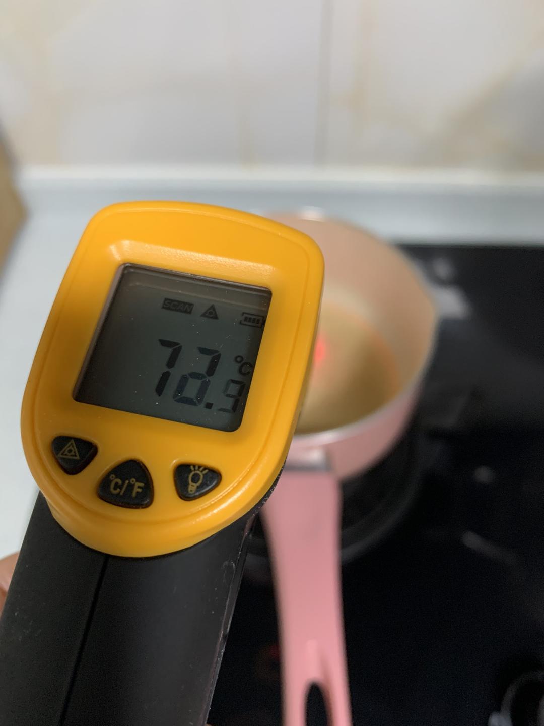 油放入锅,小火煮到70度左右关火