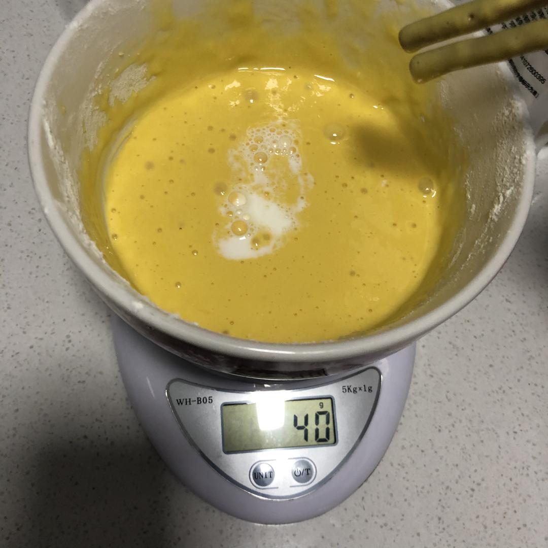 两只蛋黄和一个全蛋,加40g蛋糕粉搅拌均匀