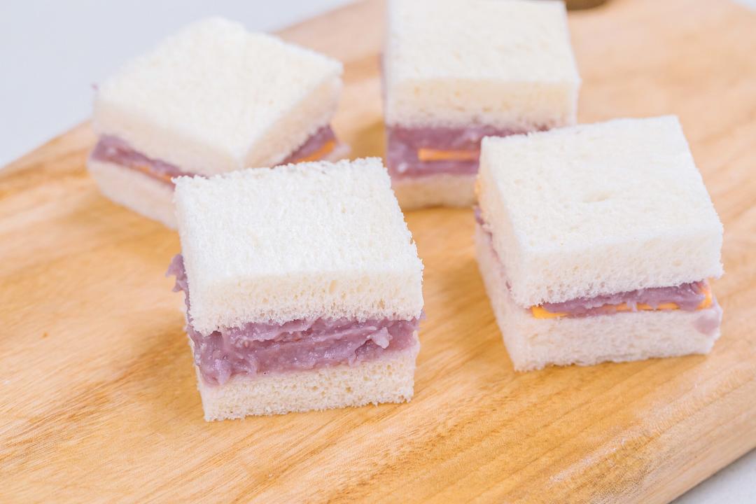 1、没有紫薯粉可以不加,但芋泥颜色就没那么好看。 2、除了芋泥,直接用紫薯泥也可以。 3、如果没有炼乳,也可以将15g炼乳换成10g牛奶,但奶香味就没那么浓郁。 4、切下来的吐司边皮,可以用烤箱150℃烤8分钟,非常酥脆!