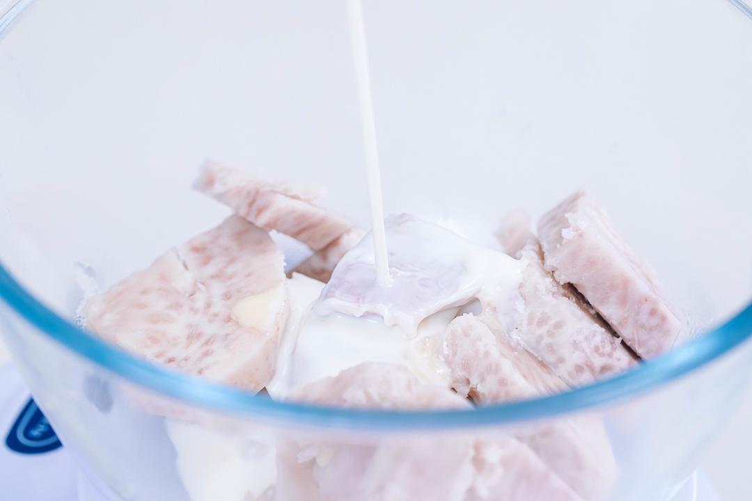 取200g蒸好的芋头,加入15g炼乳和20g牛奶。