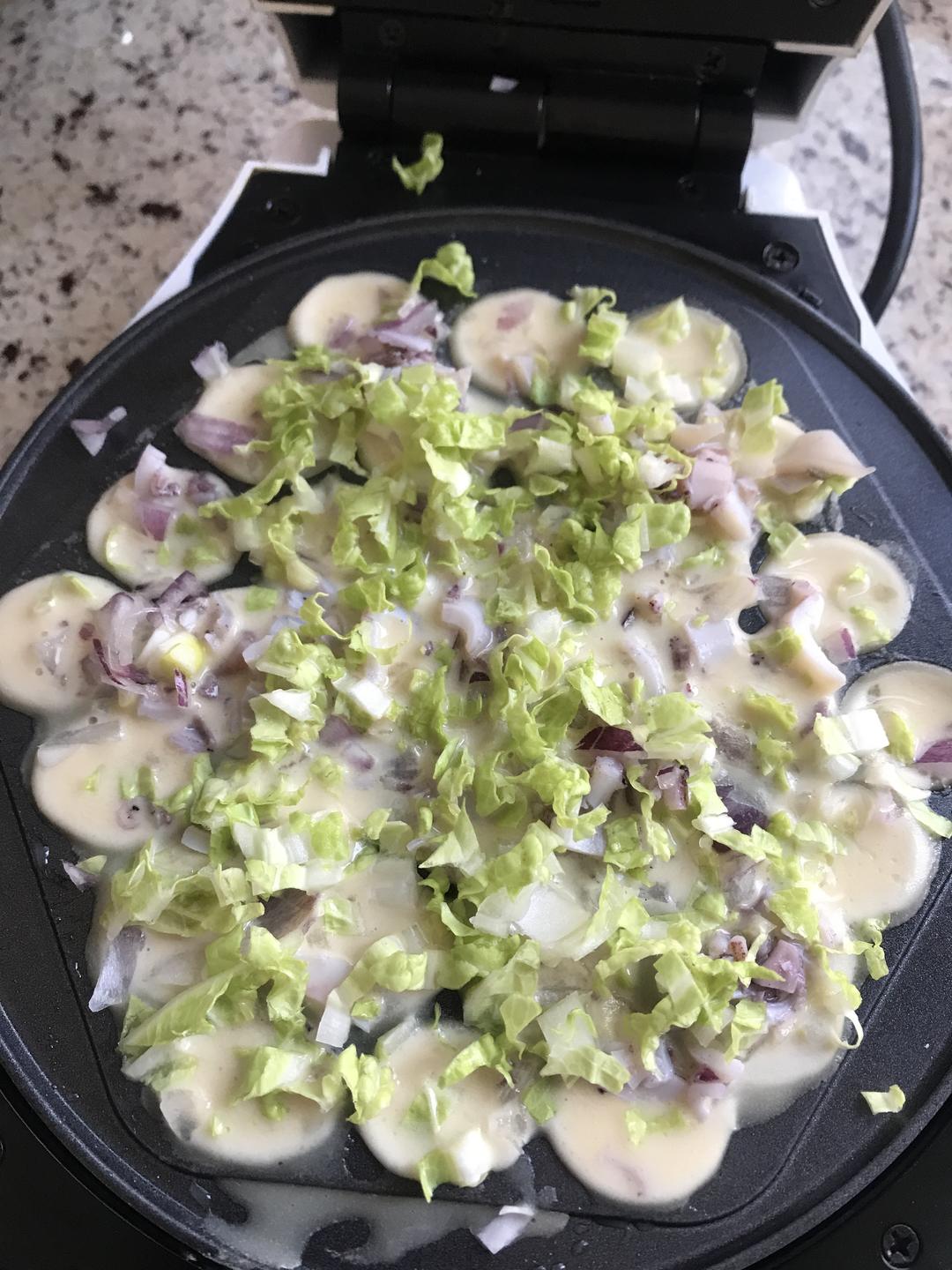 撒上 包菜碎(白菜碎)洋葱 鱿鱼碎 盖盖 开火焖2分钟