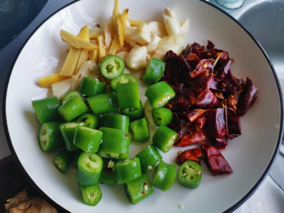 再准备好佐料: 1.郫县豆瓣酱 2.图中:干辣椒,青辣椒、姜蒜