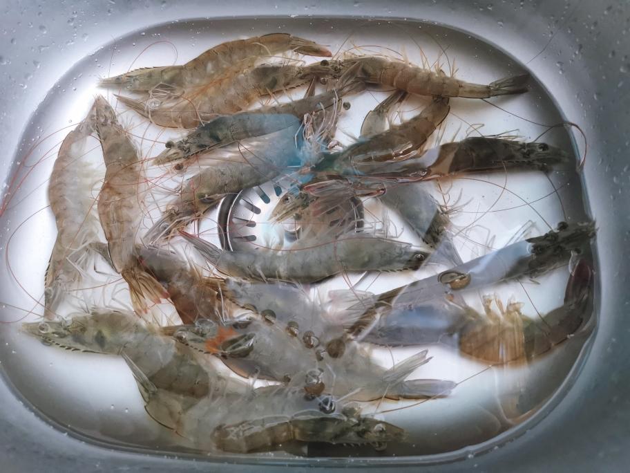 新鲜活虾清水清洗后,去头和虾线,控水装盘备用