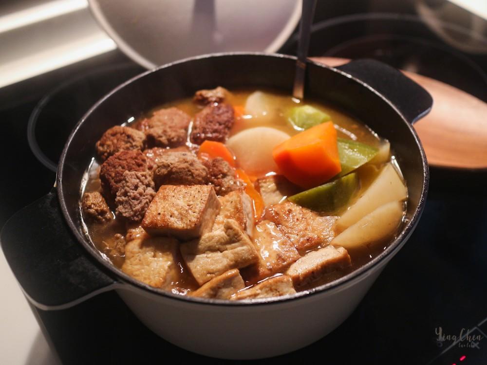 分别放入萝卜块、煎豆腐、牛肉丸、4汤匙生抽和味啉,加水但不用完全没过材料,萝卜出水蛮多;