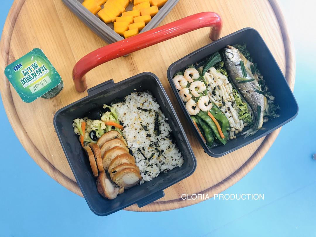 三色藜麦饭➕清炒黑木耳花菜➕鲍鱼卷➕清炒荷兰豆➕ 虾仁➕金针菇➕清蒸小黄鱼➕芒果➕酸奶