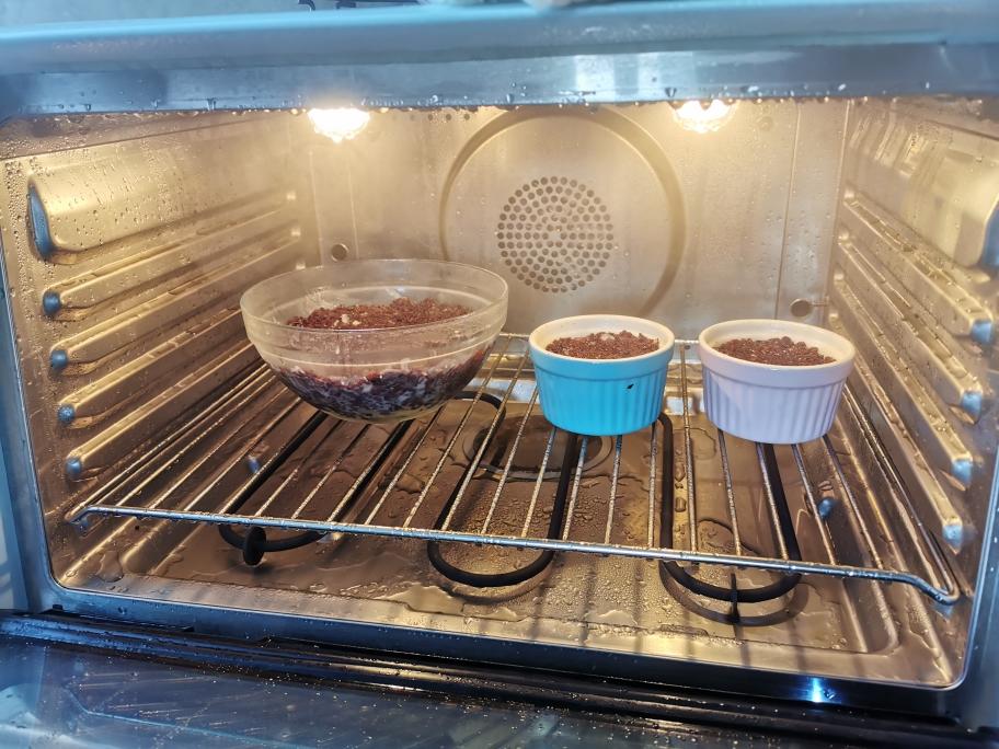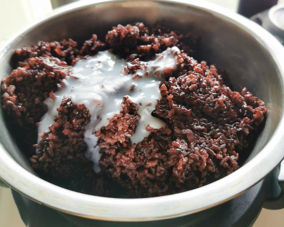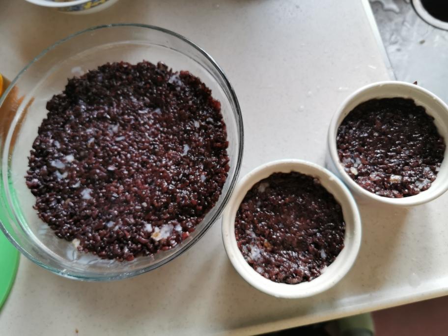 紫糯米洗干净加水浸泡2小时,倒入小美网锅,把网锅置入主锅,主锅加水1100毫升,设定:20分钟/温度100/速度4烹煮,煮好后不动,焖5分钟。