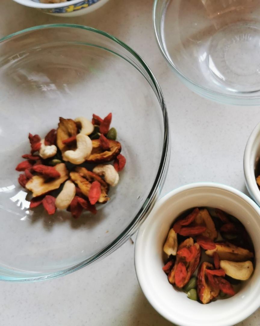 取一个或者几个大小碗,底部刷油,把红枣坚果等按照自己喜欢的当时摆放好。