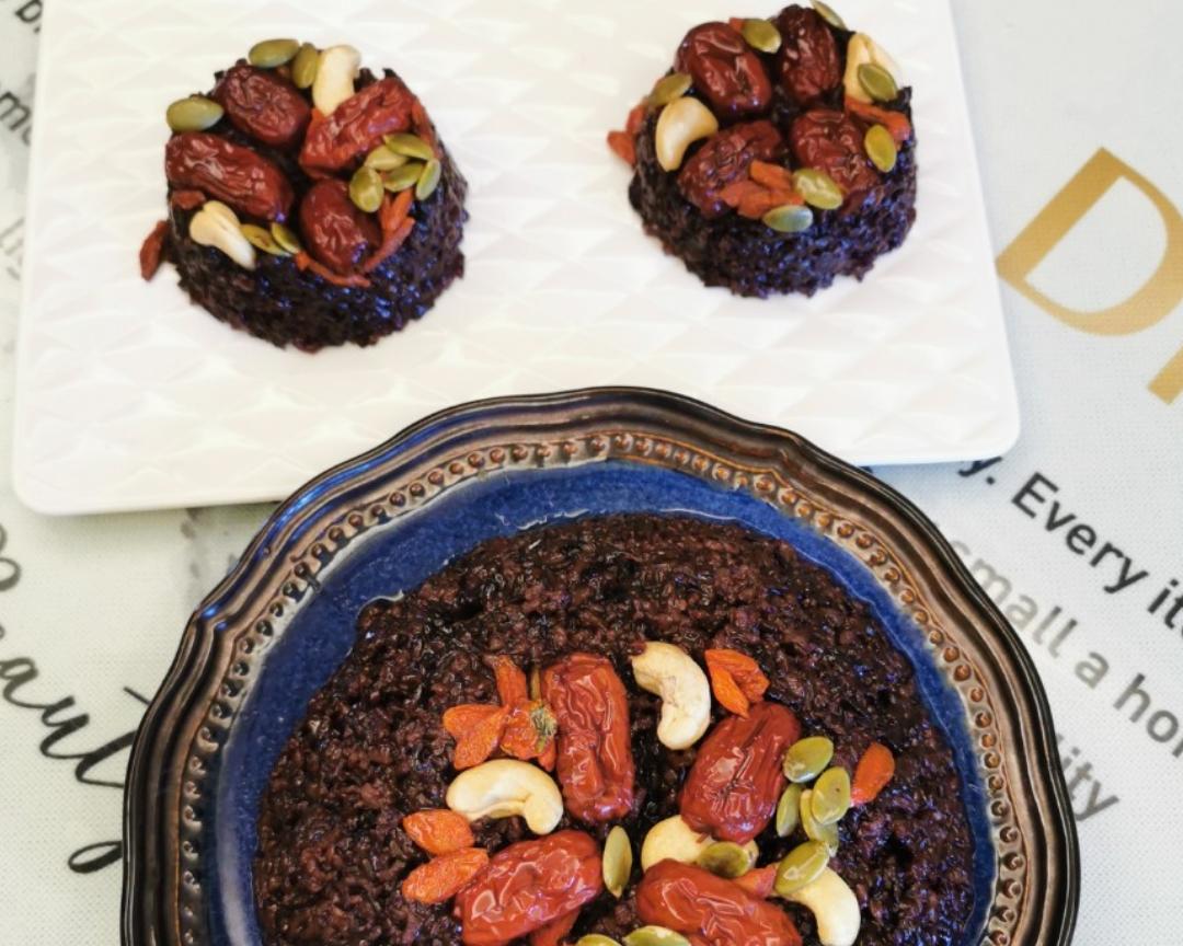 蒸好后取出,找个漂亮的盘子,把糯米饭倒扣出来,一份香甜的紫糯米八宝饭就做好啦!