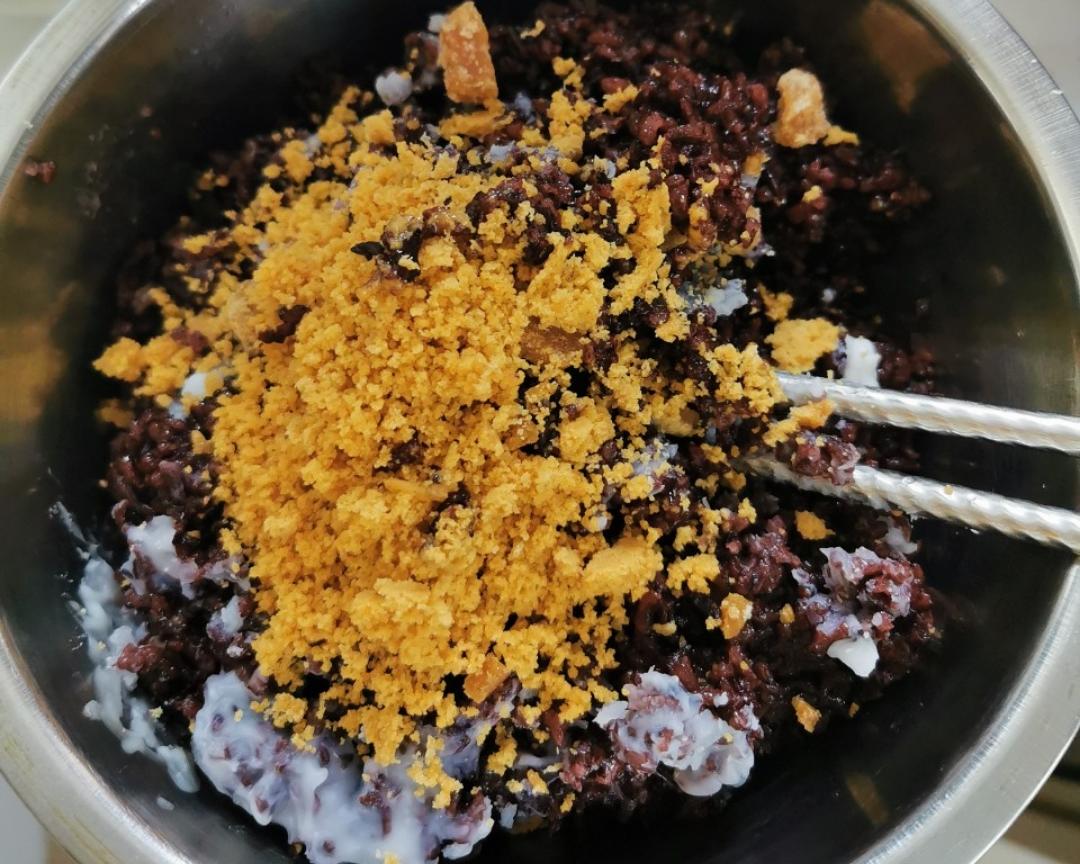 煮好的紫糯米加入25g猪油,用筷子和刮刀棒辅助搅拌均匀。