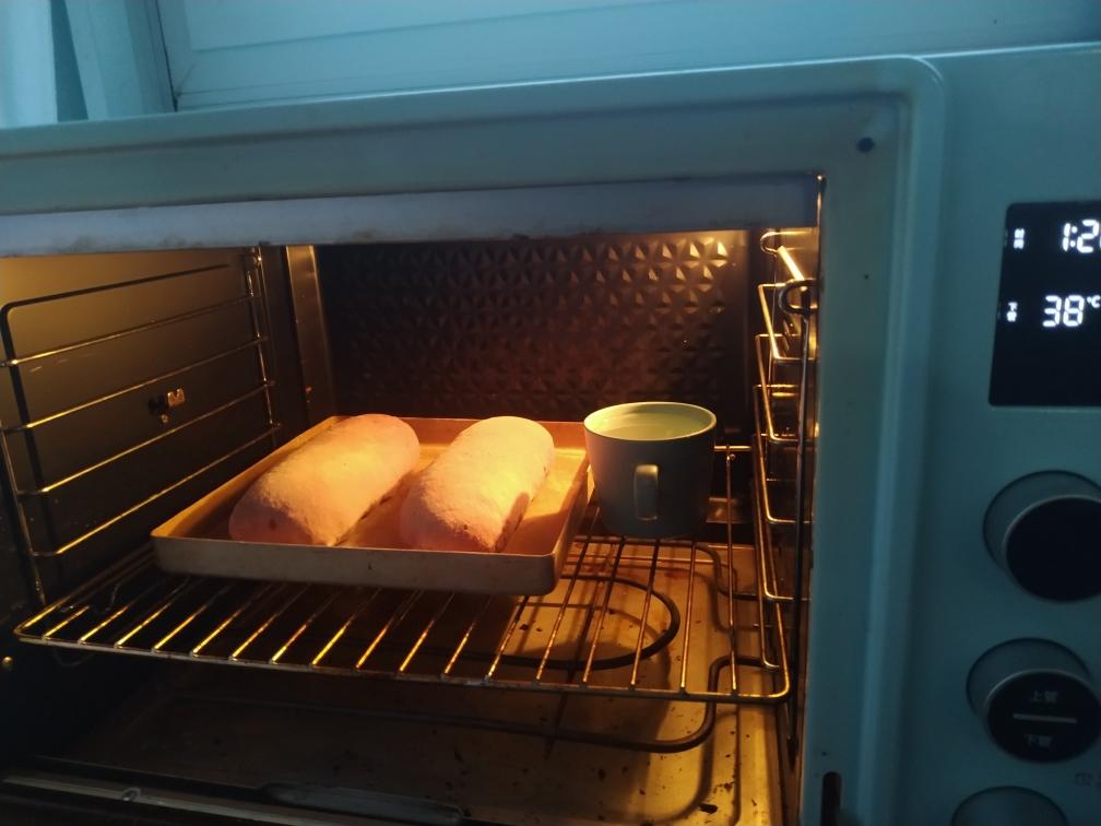 烤箱发酵,放一杯热水增加湿度,38℃一个小时左右,要看状态,不要发酵过头了。