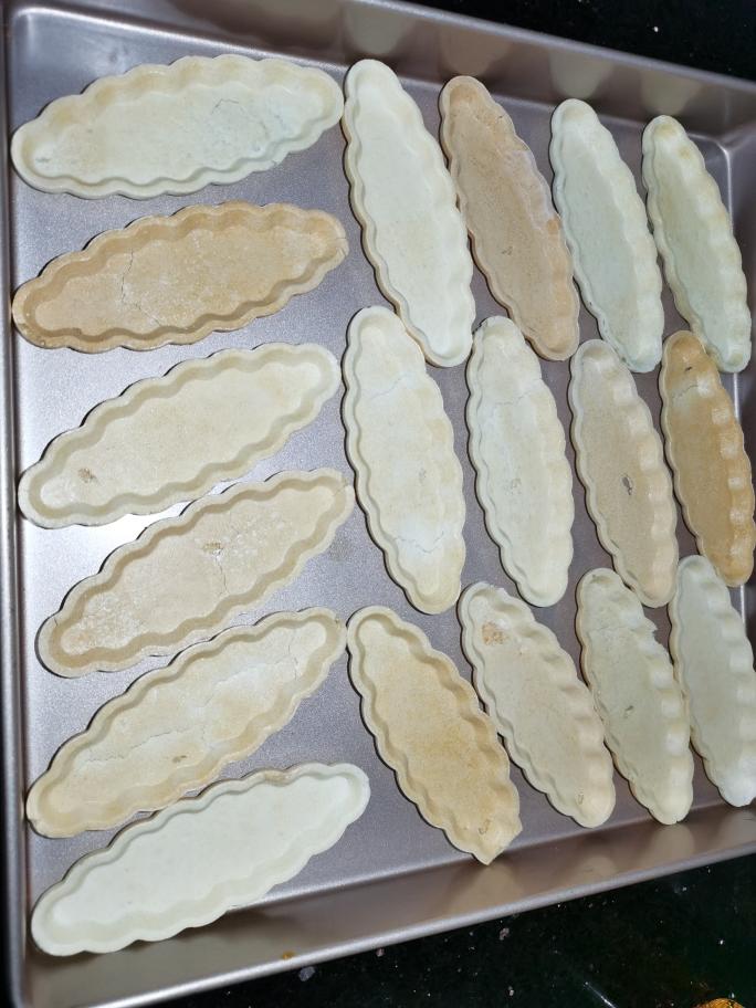 摆放好糯米船托,10分钟后拿出切片同时预热烤箱160℃上下火,5分钟