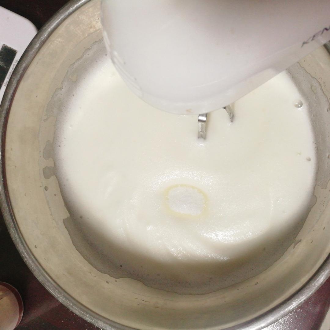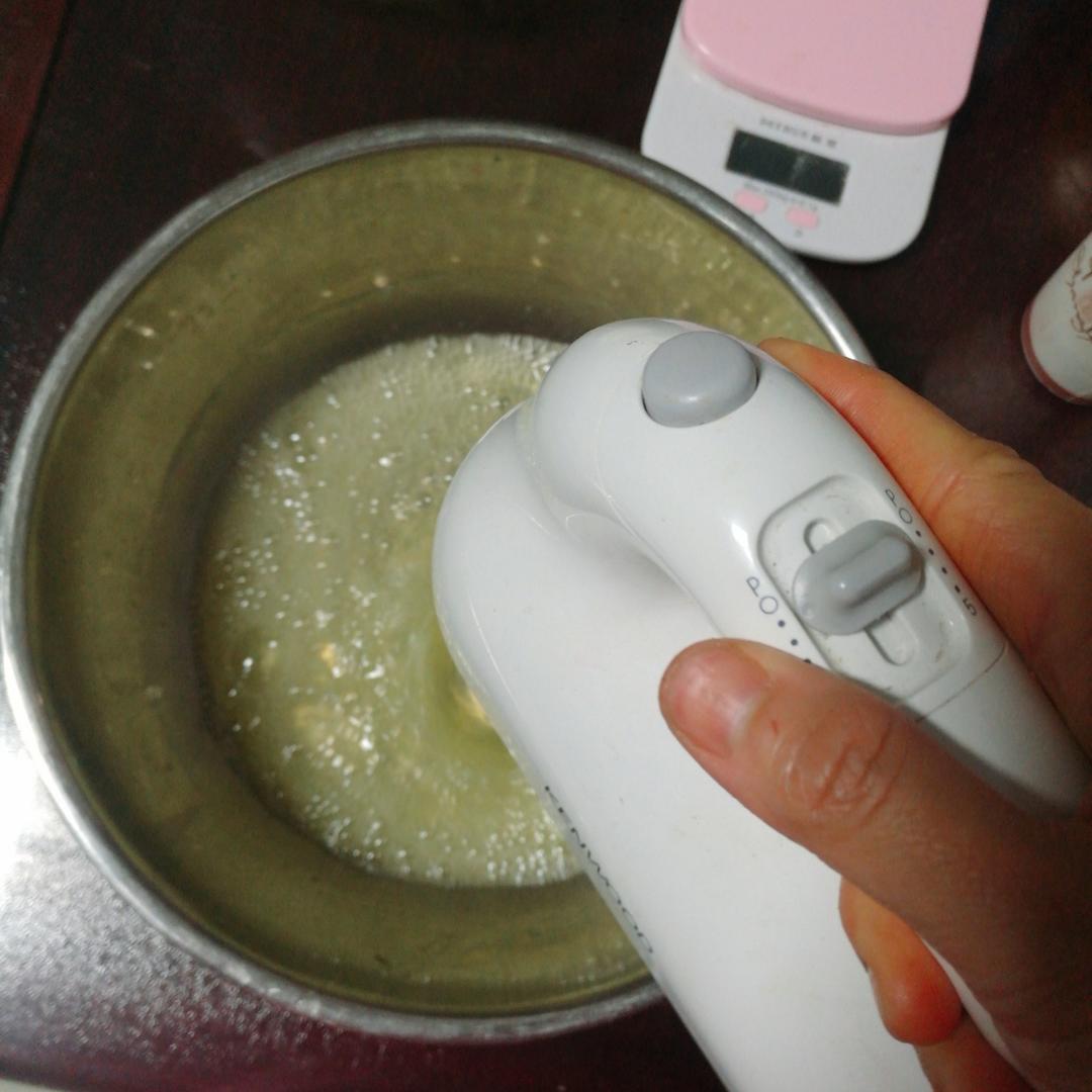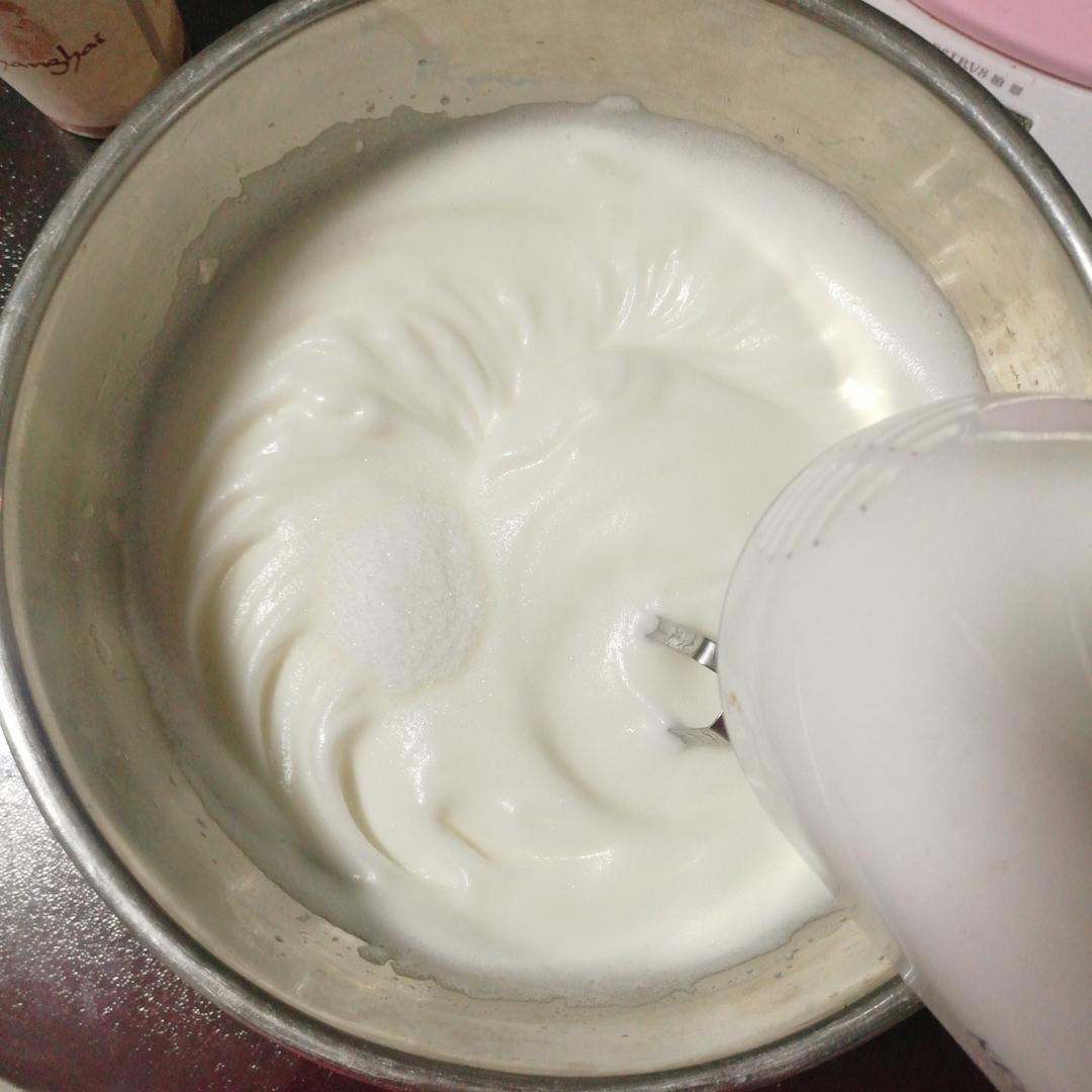 然后调至中速将蛋白打至细腻状态,加入第一次的糖量,继续中速打发。