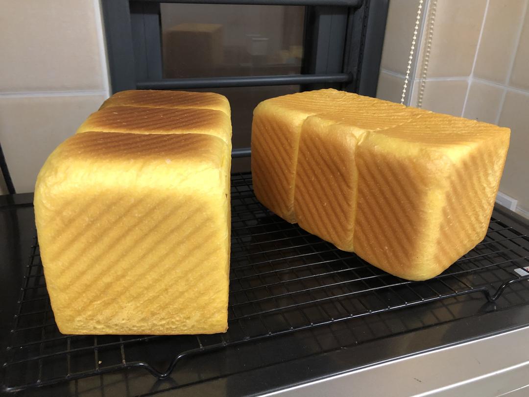 没有拍八分满的照片。加盖放入预热好的烤箱,我用的三能和学厨吐司盒,学厨导热性强,需要加裹锡纸。三能导热性没那么强。针对我家吐司盒的情况,我一般都是205度上下火烤。这次烤了40分钟。学厨的盒子去掉锡纸后在烤箱内多烤了3分钟,这样上色更好看些。照片中左边那个是学厨盒子出来的,右边是三能盒子的。说实话,还是三能的好用,成色均匀漂亮。
