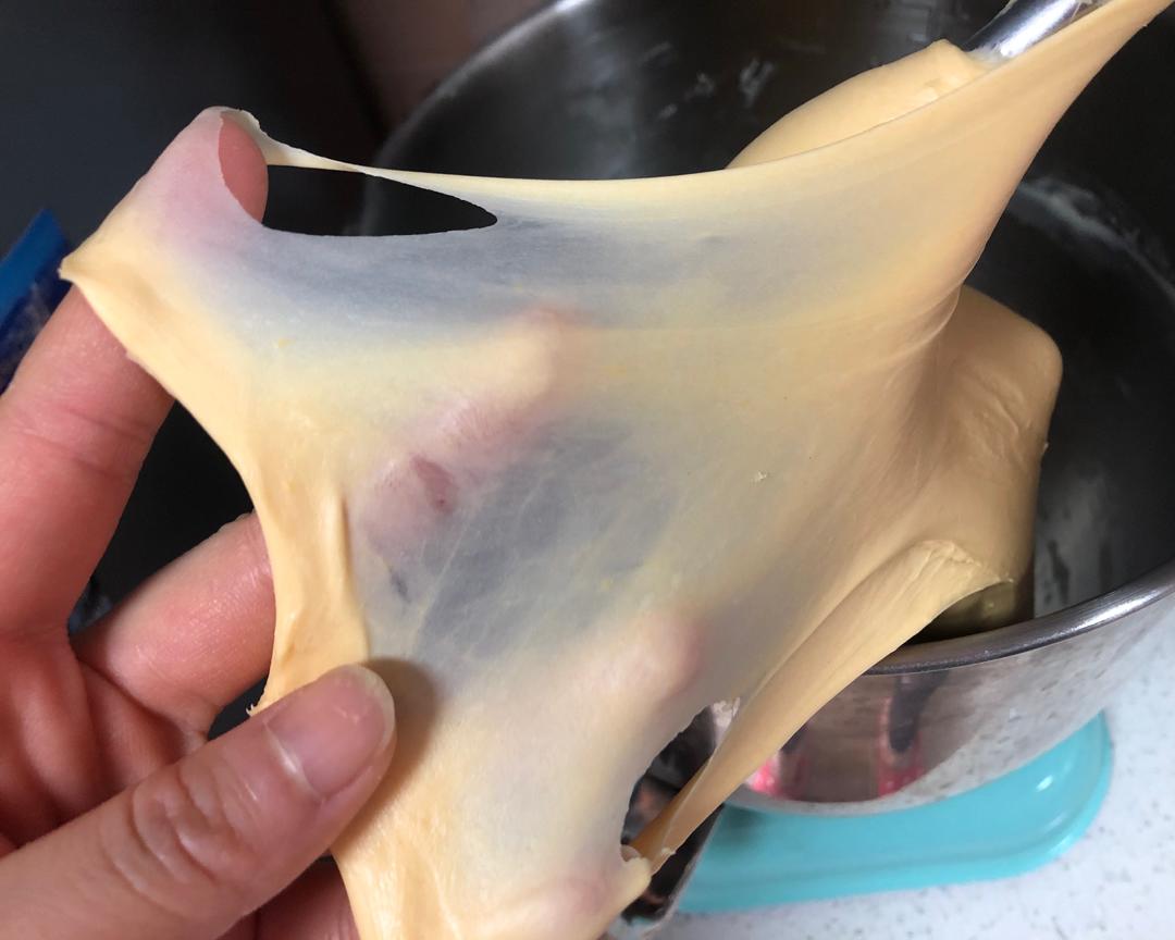 加入黄油时候膜的状态,面团已经比较软了,单手拉开膜撕开的洞只有很少的小锯齿了