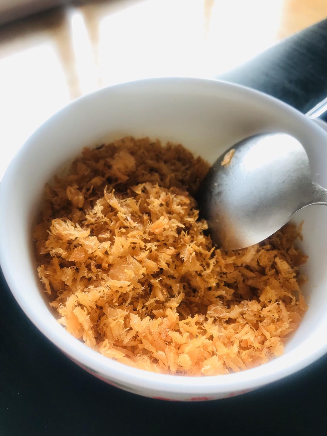 平底锅烧热把鱼肉松倒进去小火慢慢炒,三文鱼本身脂肪比较多就没必要放油,不过喜欢的可以加一点黄油会更香。一定要小火慢慢翻炒到肉松中的水分蒸发干。