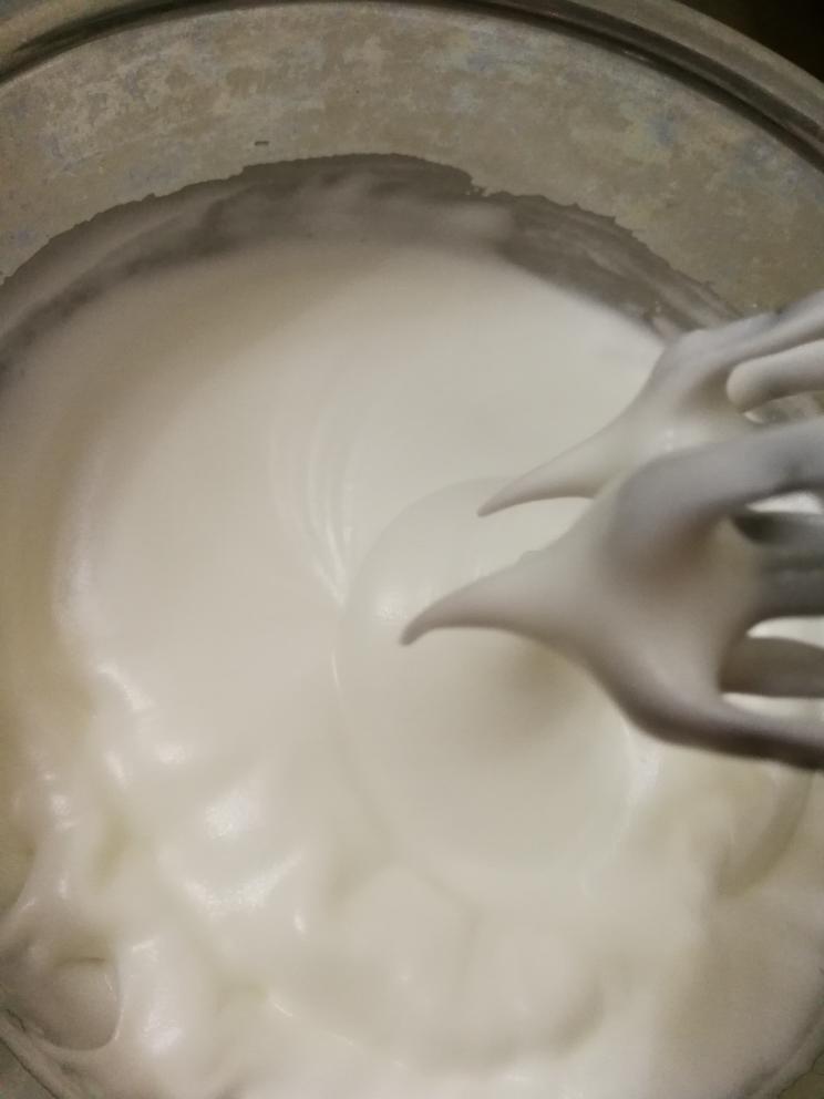 蛋白加柠檬汁分三次打发至湿性状态,此时预热烤箱180℃