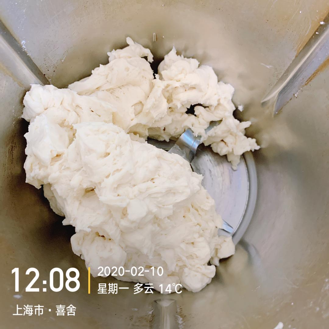 倒入高筋粉,2分钟,速度从3慢慢加到速度6,混合成珍珠粒状。