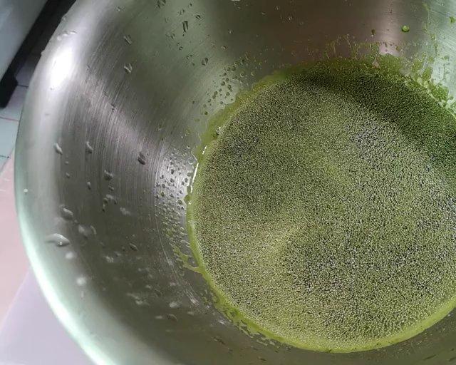 85g菠菜汁加入1.5g小苏打后,混合均匀,再加入2g酵母,轻轻晃动盆,使酵母融化